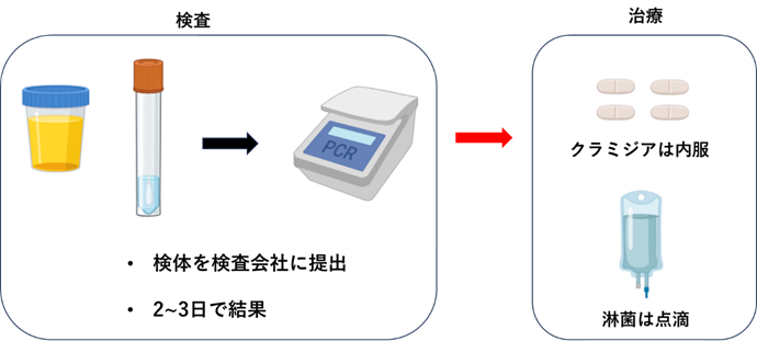 クラミジアは抗菌薬の内服、淋菌は抗菌薬の点滴をすることで外来で治療が可能です。